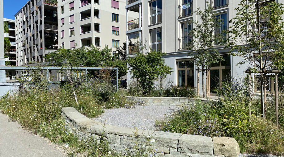 In dieser noch jungen Überbauung hat die Baugenossenschaft «mehr als wohnen» zusammen mit der Forschungsgruppe Pflanzenverwendung der ZHAW bereits mehrere Entsiegelungen umgesetzt, weitere sind aktuell im Gang und geplant.