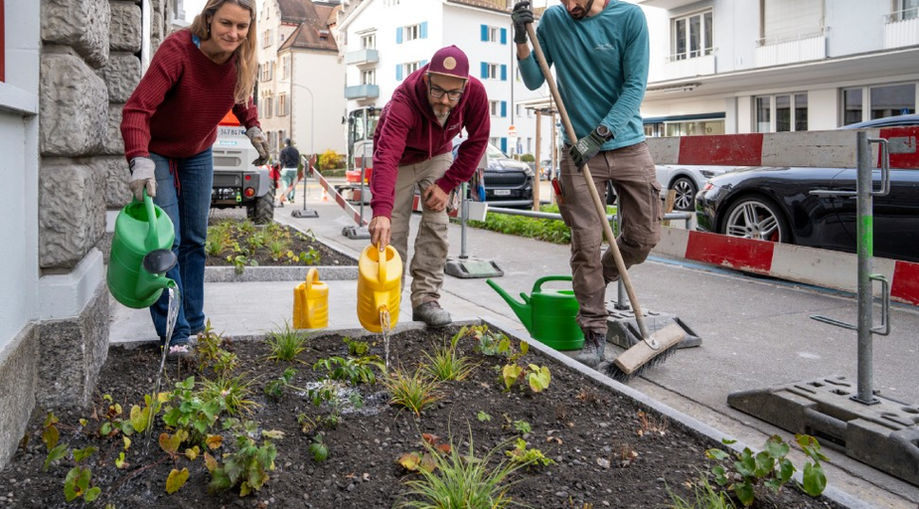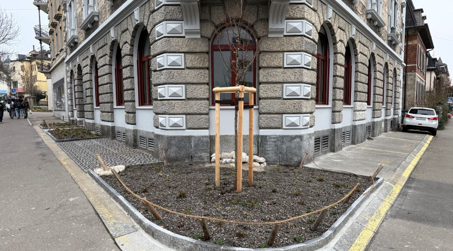 Das denkmalgeschützte Haus an der Gemeindestrasse war umgeben von betonierten Parkplätzen. Doch sie wurden kaum je genutzt. Die Besitzerinnen haben sich daher den Vorgarten zurückgeholt und sogar noch einen Baum gepflanzt.